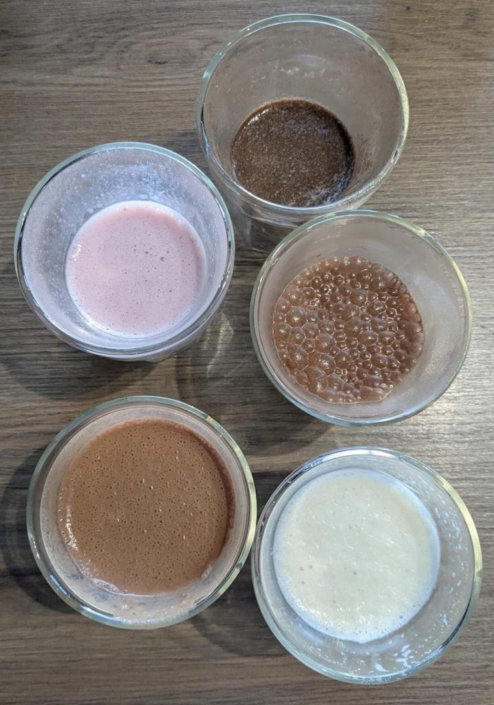 This had an unpleasantly artificial aroma. The taste was much better fortunately, and was a rich satisfying chocolate. The aftertaste is very sweet. The texture is airy and light but it does tend to separate very quickly so you’ll need to keep stirring or swirling it in your shaker between sips. It’s also not one you can have half of and put down while you make dinner or set up your tent – it becomes gelatinous and gloopy (almost solid!) in a matter of minutes when left to sit.